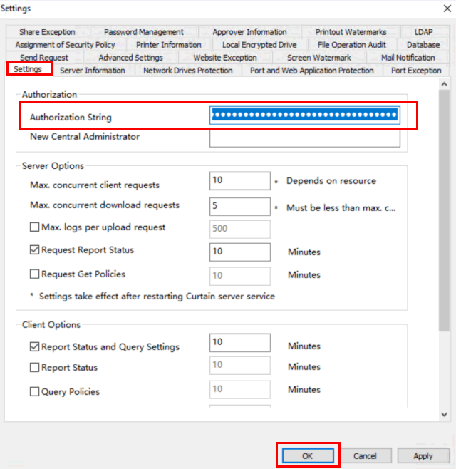 6. In Curtain Admin, select “File > Settings” in the menu. Then, “Settings” window will be shown. Enter Authorization String and Click OK.
