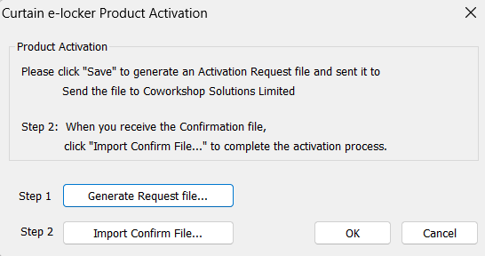 4. Click “Generate Request file…” button to generate Activation Request File, and send this file to Coworkshop ([email protected]). After receiving your activation request, Coworkshop will send file(s) back to you.