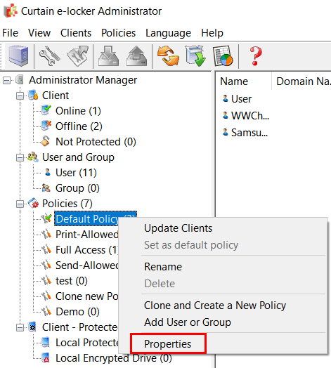 1. In Curtain Admin, select a Policy Group and right-click to select “Properties”.