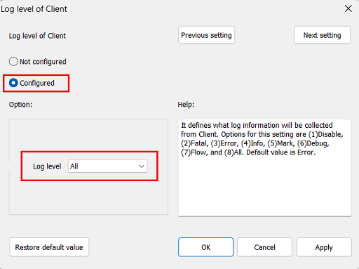 3. Double click “Log level of Client” , select “Configured” and Log level equal to “All”.
