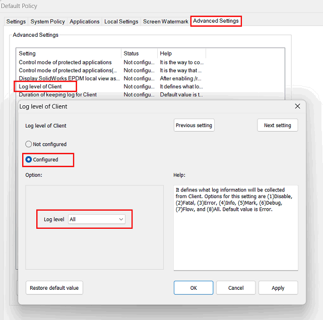3. Double click the option of “Log level of Client”, select “Configured” and Log level equal to “All”.