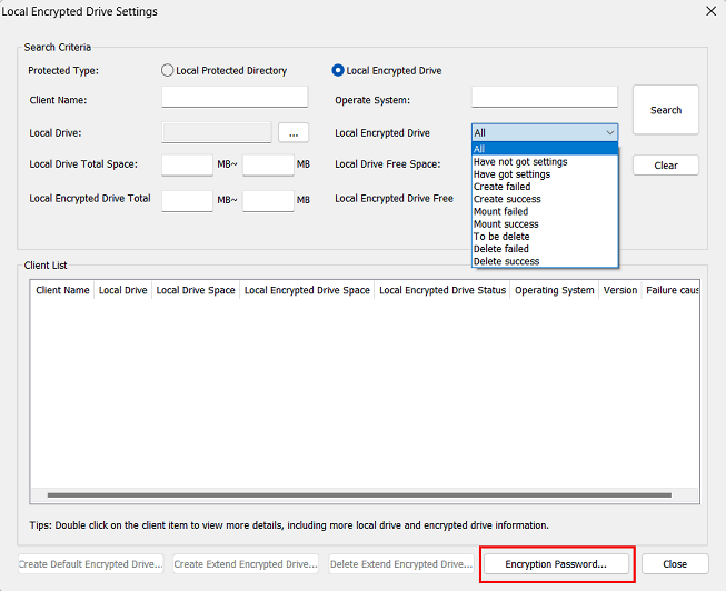 4. Click Search to find out all clients which failed to mount/create Local Encrypted Drive.