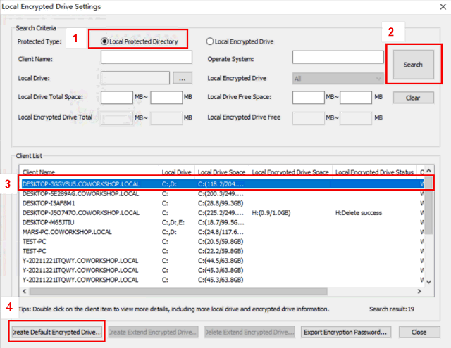 Step 2. Search clients and create default Local Encrypted Drive.