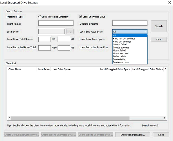 Now, you can find out clients and apply suitable settings to those clients for creating Local Encrypted Drive (described above). For example, you can select Local Protected Directory to search for clients that have not adopted local encrypted drive. Or, you can select Local Encrypted Drive to search for clients that have created local encrypted drive.