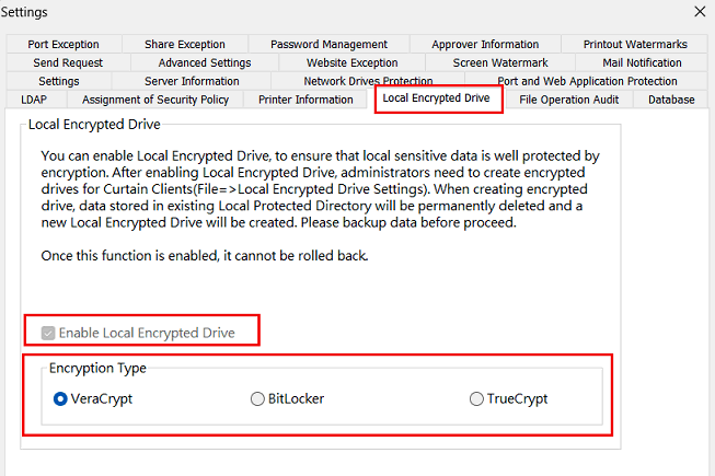 1.2. In Local Encrypted Drive tab, check “Enable Local Encrypted Drive” as below.