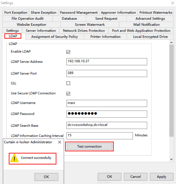 10. While setting is finished, click “Test connection” button to see whether connect to AD successfully or not.