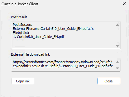 8. After the upload is successful, click the “Copy Link” button and send the link to the external user via email or other ways. Click the “Close” button to exit the operation.