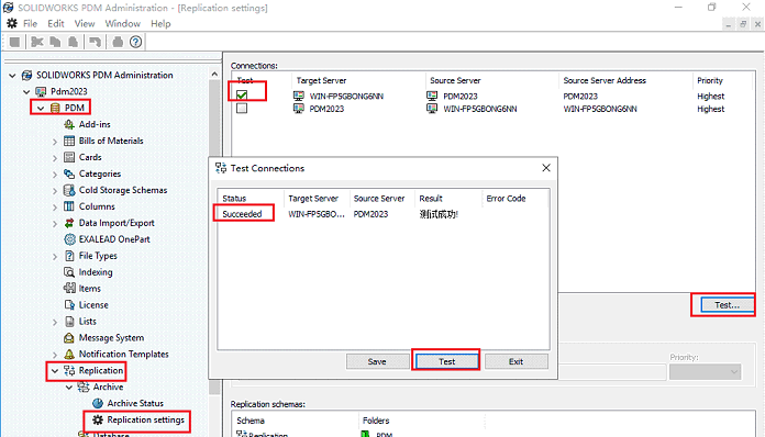 5. Click “Test” button, if status show “Succeeded”, means replication works.