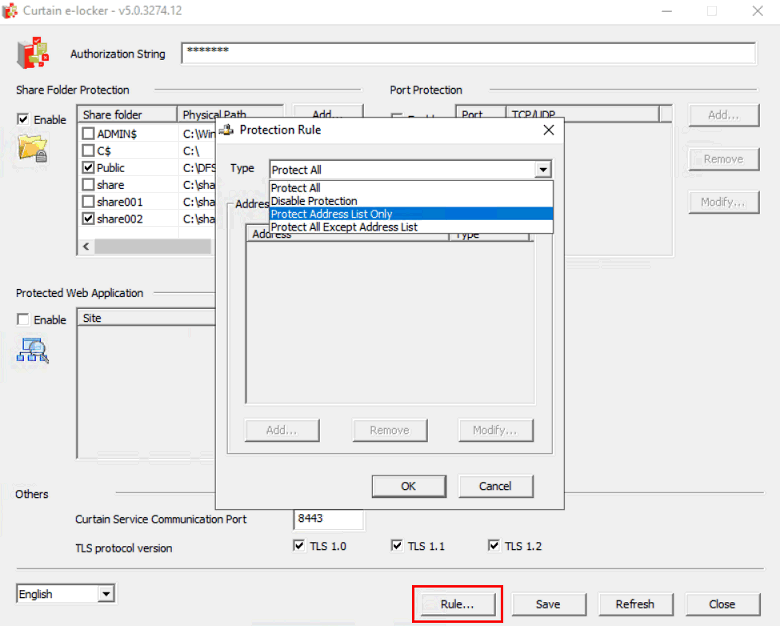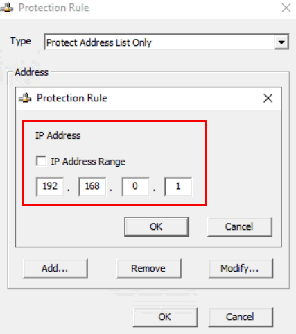 3. If “Protect Only Address List” or “Protect Except Address List” is selected, click “Add” button to add workstation’s IP to the list.