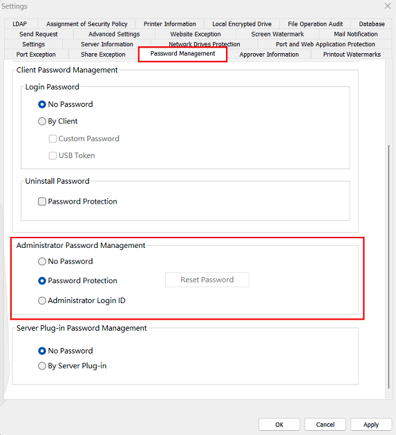 2. In Password Management tab, check “Password Protection” under Administrator Password Management as below. If it is the first time to set password for Curtain Admin, a dialog box will be shown for entering new password. Otherwise, the last password will be used.