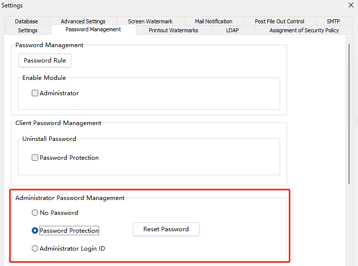2. In Password Management tab, check “Password Protection” under Administrator Password Management as below. If it is the first time to set password for Curtain Lite Admin, a dialog box will be shown for entering new password. Otherwise, the last password will be used.