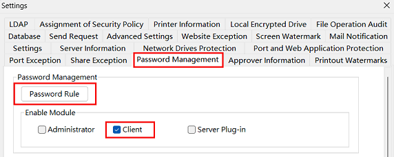 The password function can be enabled on Curtain Admin, Curtain Client, and Server Plug-in, and the Password Rules can also be set for each module.