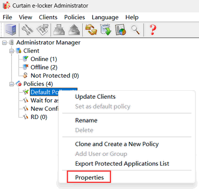 2.1 In the Curtain Admin, Select the policy group, right-click and select “Properties”.