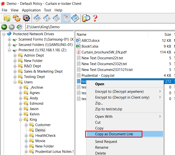 1. In protected network drive of the client, right click the file, click “Copy as Document Link” :