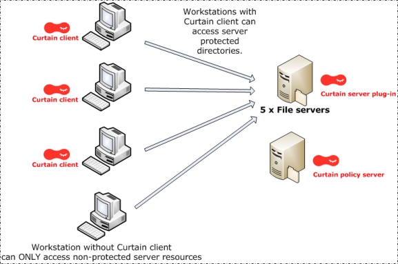 Example: This company wants to protect share folders of 5 Windows File Servers. Then, they need to install Curtain Server Plug-on on those 5 file servers.